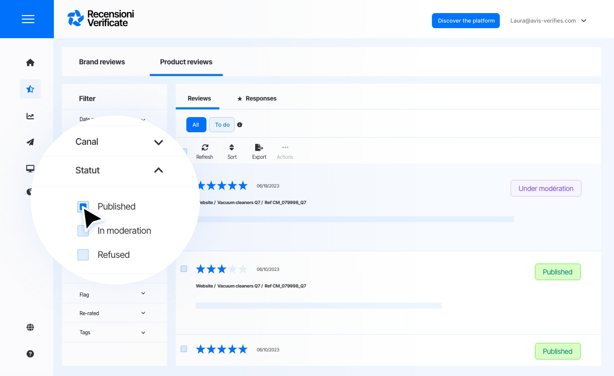 Puoi visionare tutte le tue recensioni e verificarne lo stato (“pubblicate”, “in moderazione” o “rifiutate”) dall’interfaccia di Recensioni Verificate.