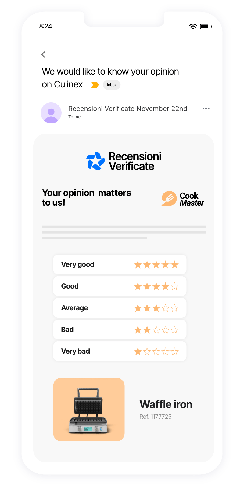Dopo l’acquisto, il cliente riceve una e-mail o un SMS di Recensioni Verificate per valutare la sua esperienza.