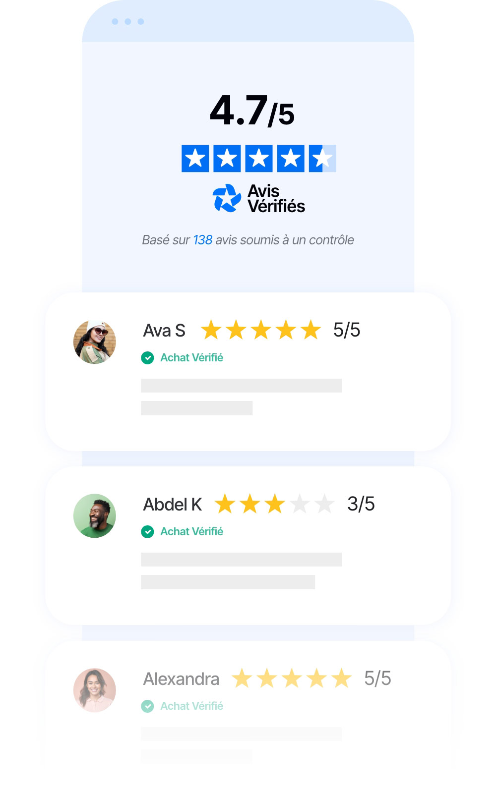 Condividi le opinioni dei tuoi clienti su larga scala e approfitta dei vantaggi della dicitura “Recensioni Verificate”. Attiva le recensioni su tutti i tuoi canali online (sito web, piattaforme di recensioni di terze parti, social media, ecc.) e offline (spot in TV, punti vendita, campagne pubblicitarie, ecc.). Le possibilità sono infinite!