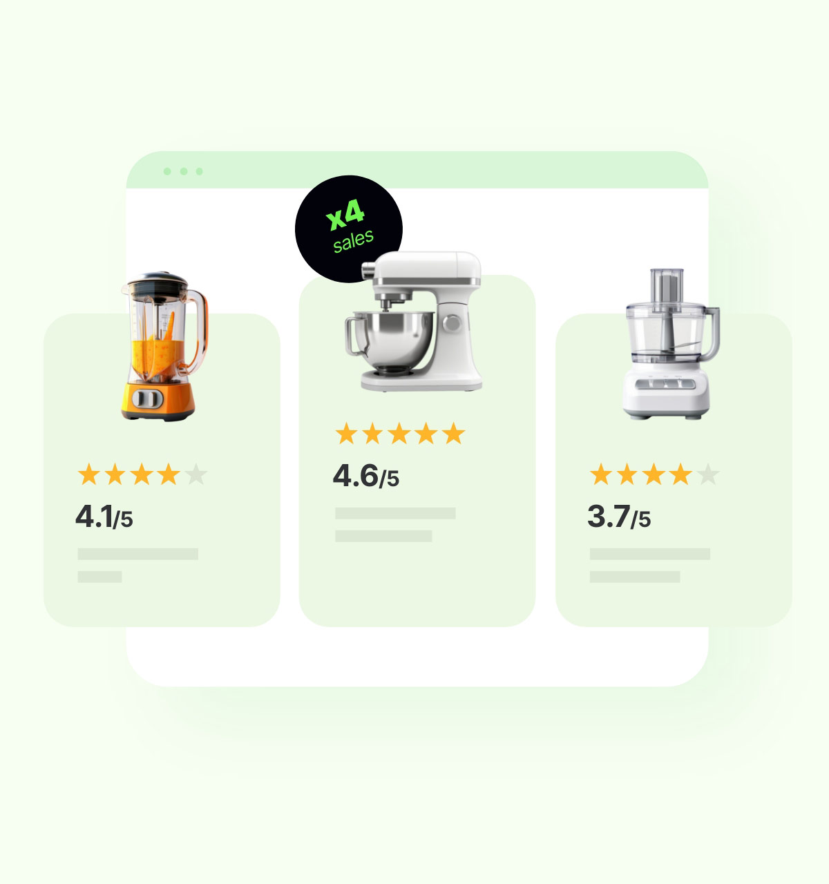 Una volta preso il controllo della tua e-reputation, vedrai la tua brand awareness aumentare — e con essa le tue vendite! Secondo McKinsey & Company, i prodotti con una valutazione di 4.5/5 stelle o maggiore, vendono quattro volte di più!